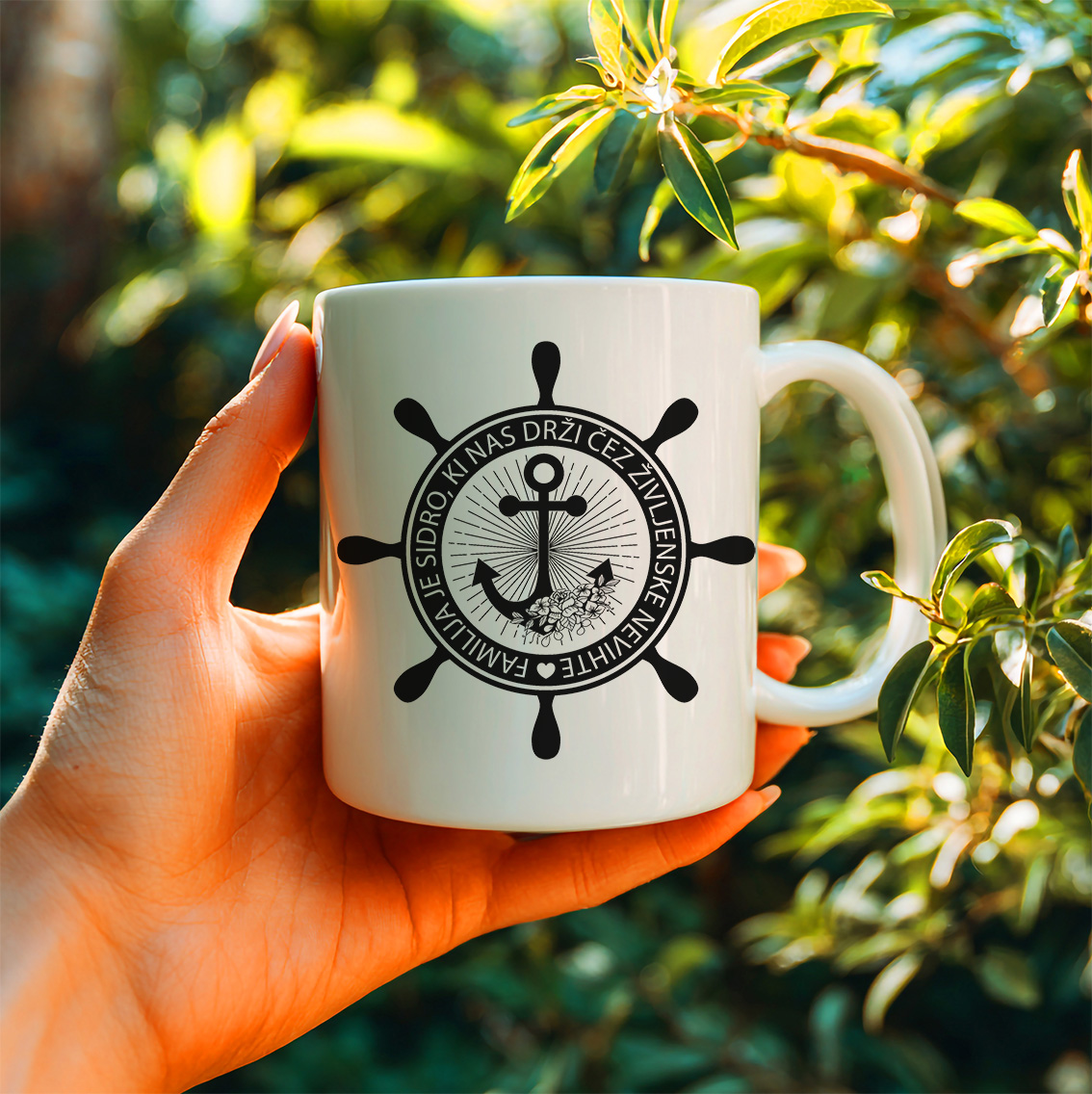 Šalica z enakim enobarvnim motivom klasičnega ladijskega sidra in napisom znotraj "Familija je sidro, ki nas drži čez življenske nevihte". Vsak požirek kave ali čaja postane majhen opomnik na največjo oporo – familijo, ki vas drži pokonci skozi vse življenjske viharje. Kakovostna keramična šalica prostornine 330 ml odlično drži toploto, motiv pa je natisnjen trpežno, da ostane lep tudi po mnogih pranjih v pomivalnem stroju.
