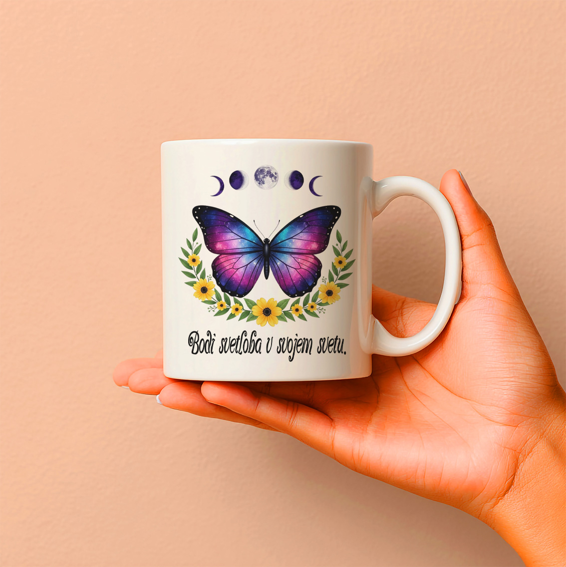 Keramična šalica z navdihujočim napisom "Bodi svetloba v svojem svetu", obdanem z velikim osrednjim metuljem in rumenimi rožicami. Vsak požirek postane trenutek, ko se spomnite, da lahko sami ustvarite pozitivno energijo in jo delite z okolico. Velik metulj simbolizira močno notranjo svetlobo, majhni pa nežno širjenje te svetlobe v svet.