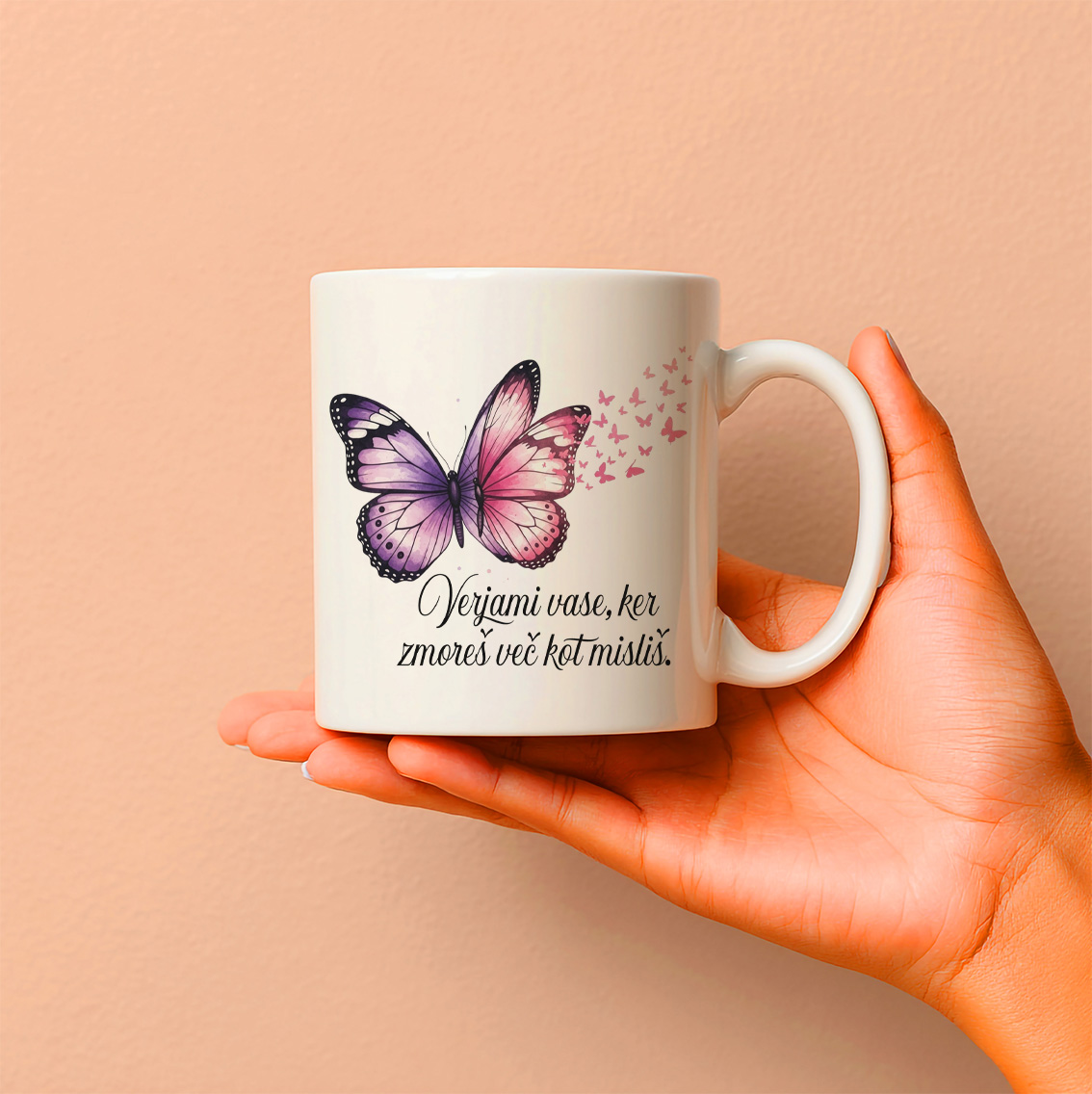 Keramična šalica z močnim napisom "Verjami vase, ker zmoreš več kot misliš", obdanem z velikim osrednjim metuljem in nežnimi majhnimi metuljčki. Vsak požirek kave, čaja ali kakava postane trenutek samospodbude in notranje moči. Metulji simbolizirajo preobrazbo in rast, napis pa vas opominja na skrite zmožnosti, ki jih nosite v sebi.