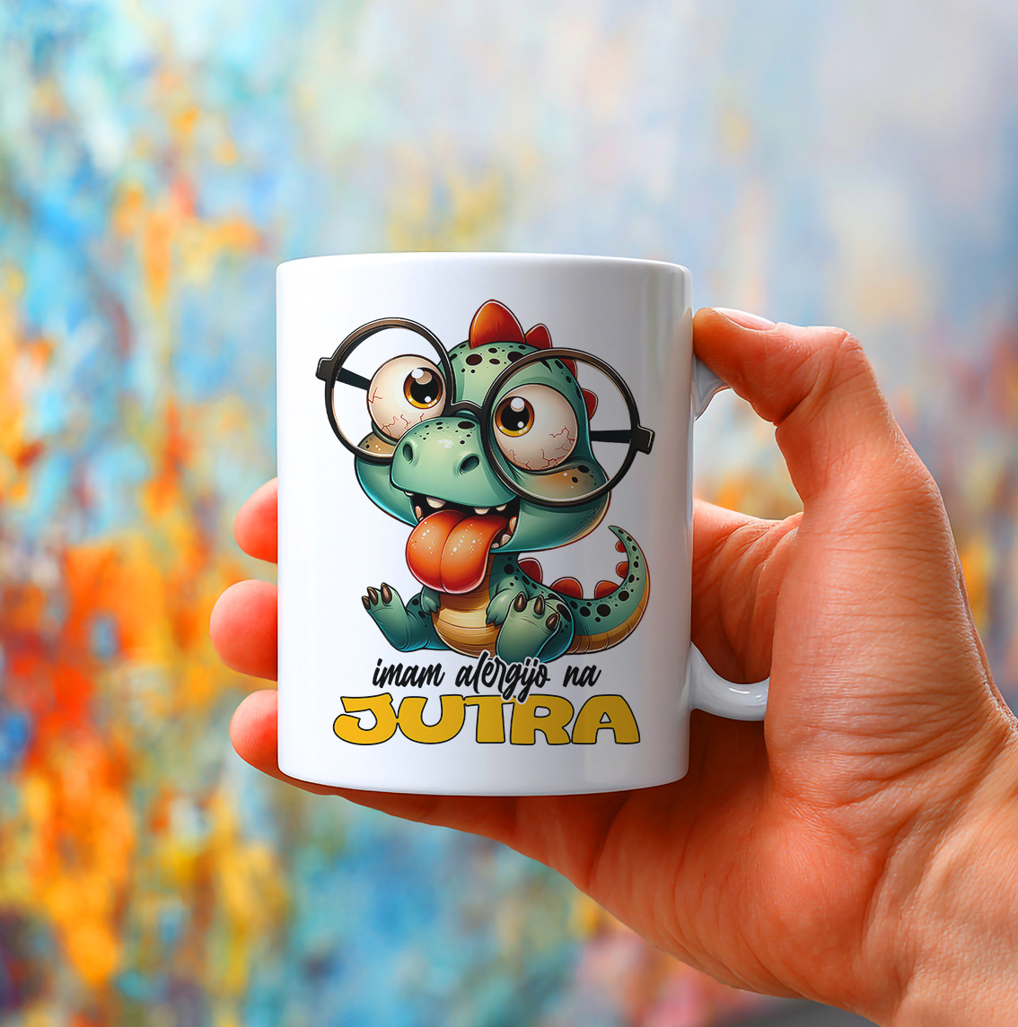 Keramična šalica s srčkanim dinozaverčkom v velikih očalih in napisom "IMAM ALERGIJO NA JUTRA". Vsak požirek kave ali čaja postane mala zmaga nad jutranjo lenobo! Motiv je popoln za vse, ki se zjutraj počutijo kot izumrli dinozavri – dokler ne dobijo prve kofeinske doze.