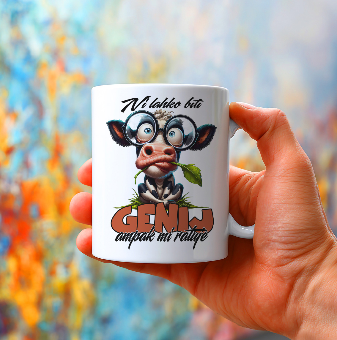 Keramična šalica z risano kravo v debelih očalih, ki mirno žveči travo in izgleda kot pravi genij, ter napisom "NI LAHKO BITI GENIJ AMPAK MI RATUJE". Vsak požirek kave ali čaja postane trenutek intelektualnega humorja in samoironije! Motiv je popoln za vse, ki se zjutraj počutijo kot geniji – dokler kofein ne začne delovati.