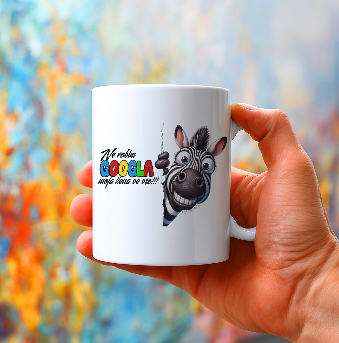 Keramična šalica z barvitim Google logotipom v različnih odtenkih in zebro, ki radovedno kuka iz strani, ter napisom "NE RABIM GOOGLA MOJA ŽENA VE VSE". Vsak požirek kave ali čaja postane trenutek humornega priznanja in nasmeha! Motiv je popoln za vse može, ki vedo, da je domača "iskalnica" vedno natančnejša (in hitrejša) od Googla.