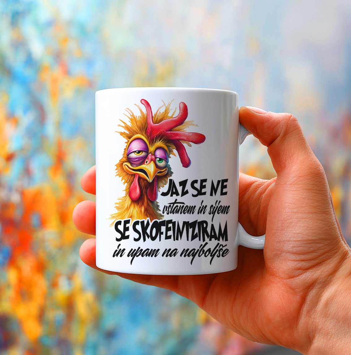 Keramična šalica s smešnim petelinom, ki je celo natečen, komaj zbujen in videti povsem nejevoljen, ter napisom "JAZ SE NE ZBUJAM IN SI JEMLJEM KOFEIN IN UPAM NA NAJBOLJŠE". Vsak požirek kave postane del jutranjega rituala upanja in kofeinizacije! Motiv je popoln za vse, ki se zjutraj počutijo kot petelin, ki bi raje še spal.