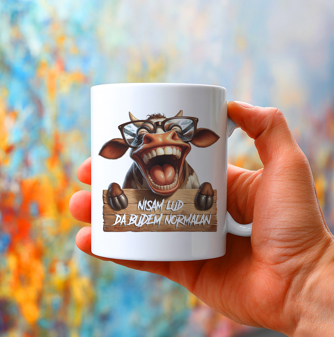 Keramična šalica z veselo kravo, ki se smeji na ves glas, in duhovitim napisom "NISAM LUD DA BUDEM NORMALAN". Vsak požirek kave, čaja ali kakava postane trenutek dobrega humorja in lahkotnega nasmeha. Motiv prinaša sarkastičen pridih in opominja, da normalnost včasih ni najboljša izbira.Ta kakovostna šalica je odličen spremljevalec jutranje rutine, službenega odmora ali večerne sprostitve. Popolno darilo za prijatelje s smislom za humor, za rojstni dan ali preprosto za polepšanje dneva.