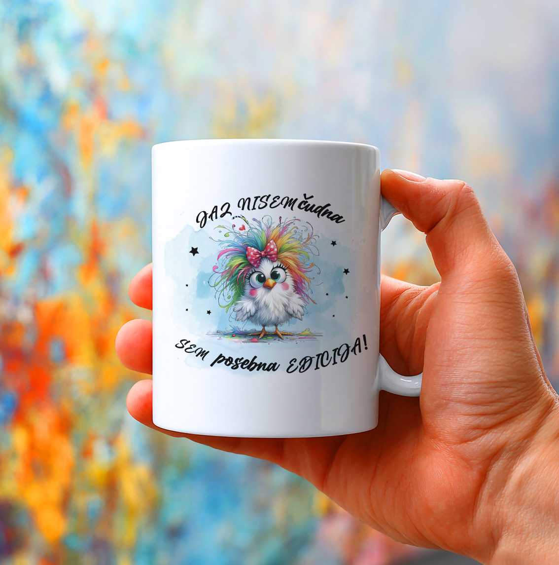 Keramična šalica s prelepo grafiko belega ptička z barvanimi dolgimi lasmi, rdečo mašnico in nedolžnim, ljubkim pogledom, ter napisom "JAZ NISEM ČUDNA SEM POSEBNA EDICIJA". Vsak požirek kave, čaja ali kakava postane trenutek nežne samoironije in pozitivnih vibracij! Motiv je idealen za vse, ki svojo edinstvenost praznujejo z nasmehom.