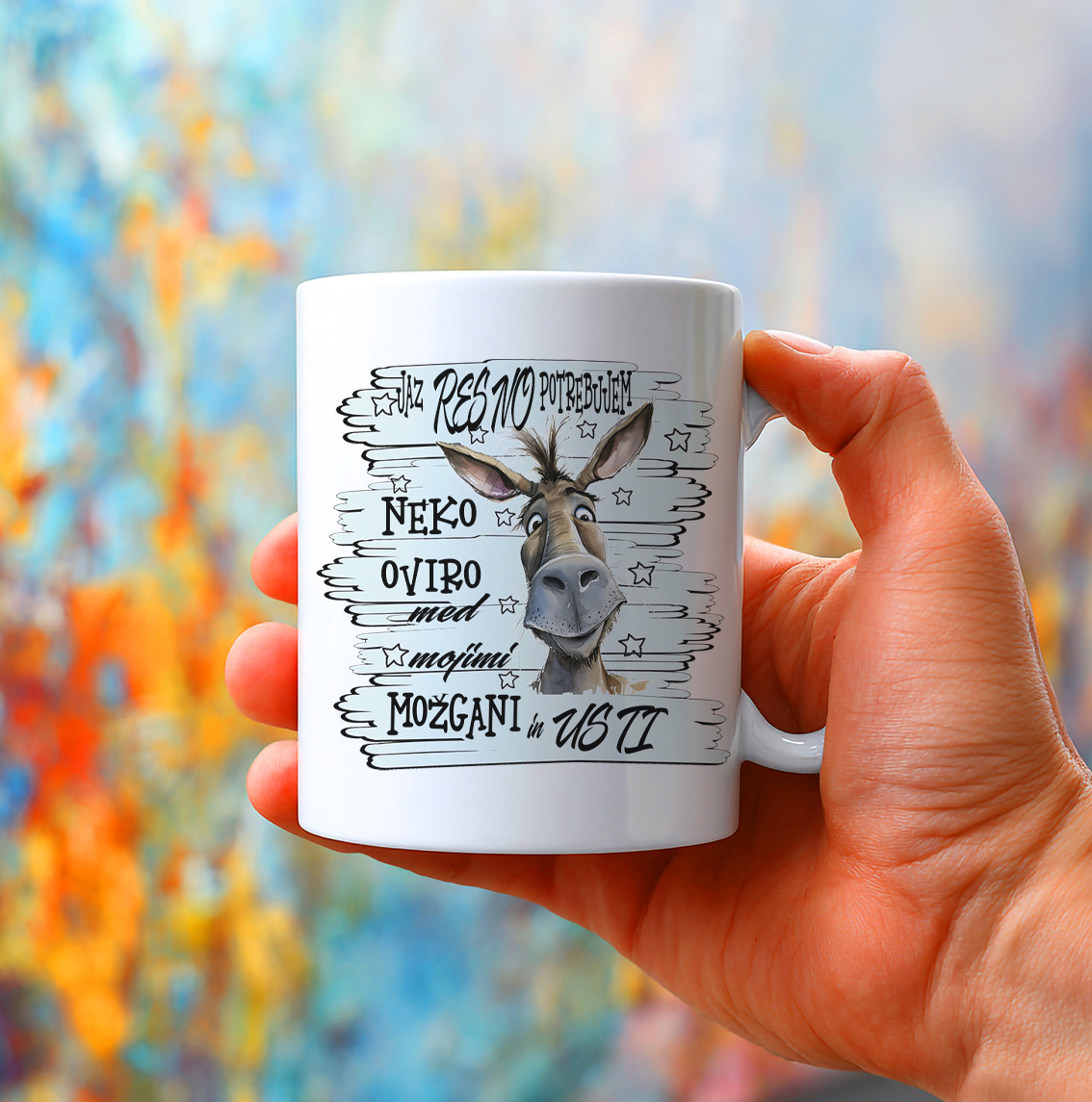 Keramična šalica z extra risanim oslom, obdanim z zvezdicami na modrem ozadju, in napisom "JAZ RESNO POTREBUJEM NEKO OVIRO MED MOJIMI MOŽGANI IN USTI". Vsak požirek kave ali čaja postane trenutek samoironije in tihega opozorila, da morda raje molčite! Motiv je idealen za vse, ki vedo, da bi jim filter med možgani in usti rešil marsikatero situacijo.