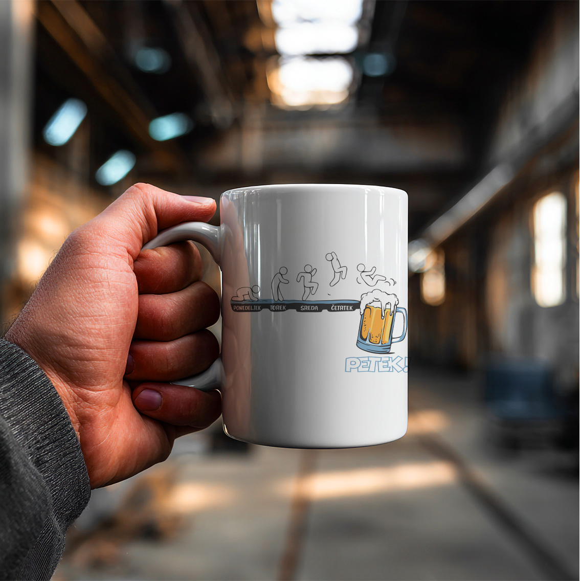 Keramična šalica z zabavno in hudomušno grafiko možička, ki se od ponedeljka do četrtka vztrajno pripravlja na veliki petkov skok naravnost v kozarec piva. Vsak požirek iz te šalice vas bo nasmejal in takoj dvignil razpoloženje – popolna za vse, ki komaj čakate konec tedna in pivsko zabavo. Ta kakovostna šalica je idealna za jutranjo kavo med tednom (ko se "pripravljate") ali za petkov večer, ko končno skočite v pravo veselje.