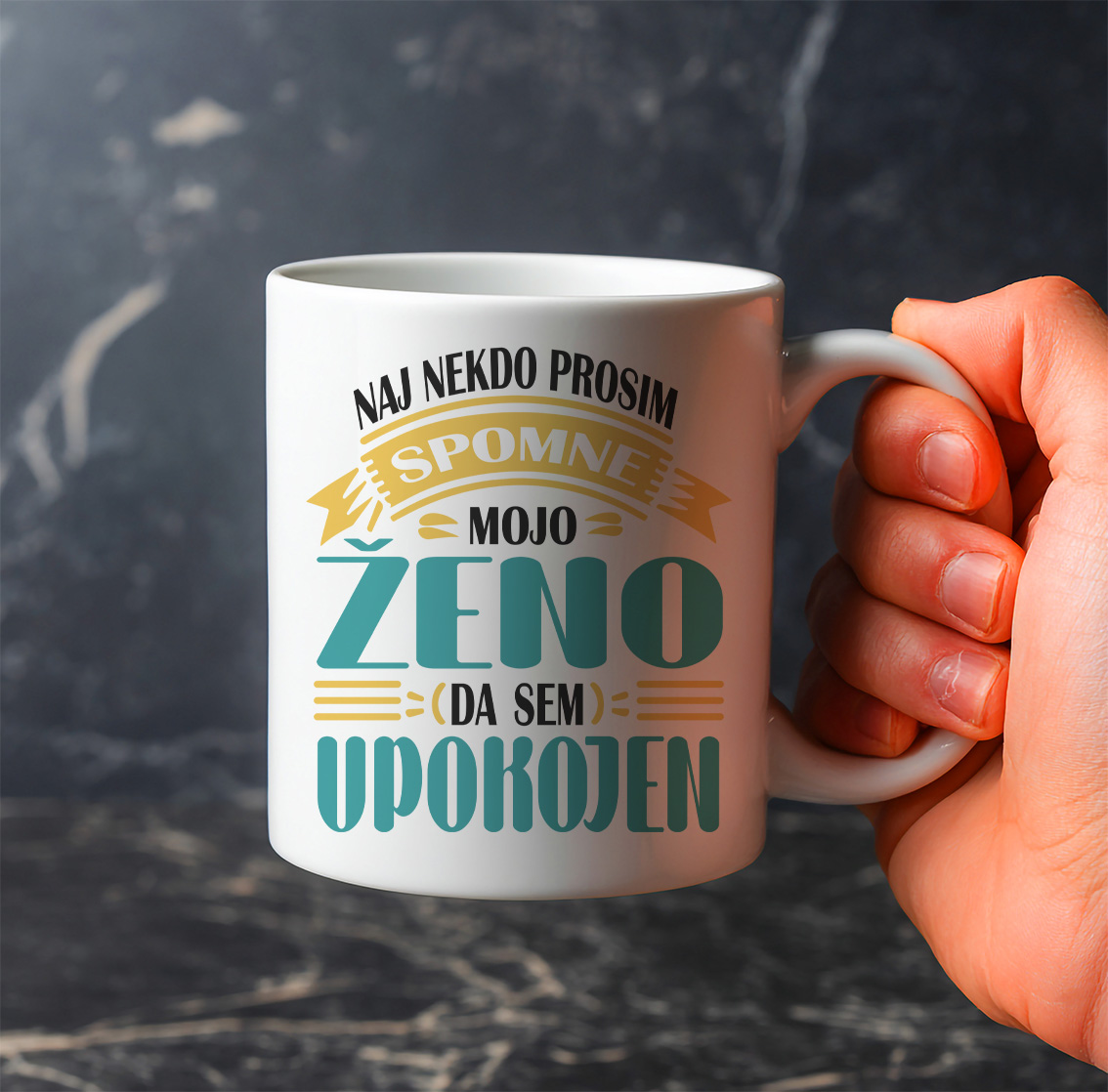 Keramična šalica s prelepo grafiko in velikim, duhovitim napisom »Naj nekdo prosim spomne mojo ženo, da sem upokojen« – okrašena z zabavnimi elementi, kot so naslanjač, pivo in lenobni motivi.