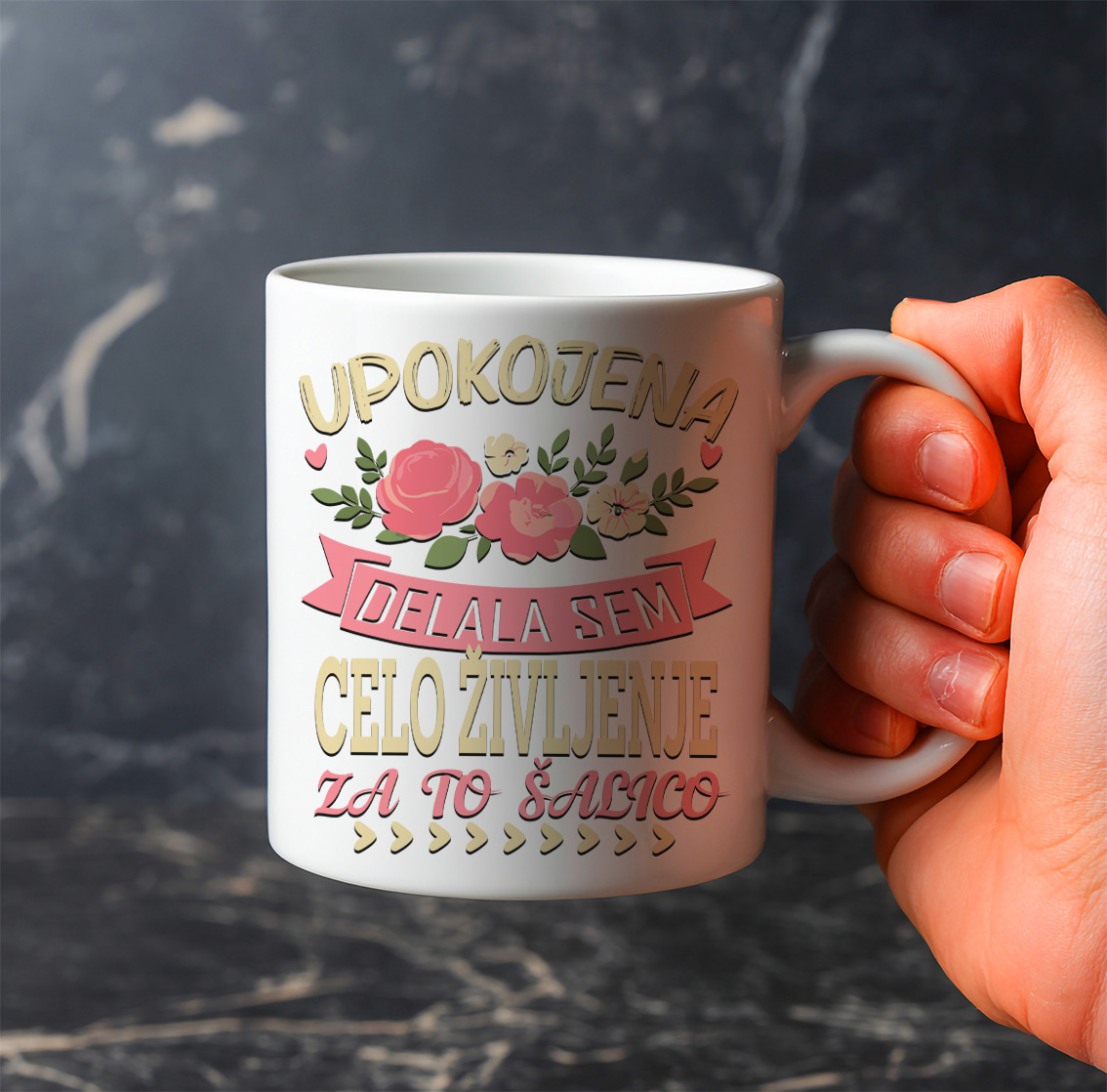 Keramična šalica s prelepo barvno grafiko – nežnimi rožicami in velikim, barvnim napisom »Upokojena, delala sem celo življenje za to majico«.